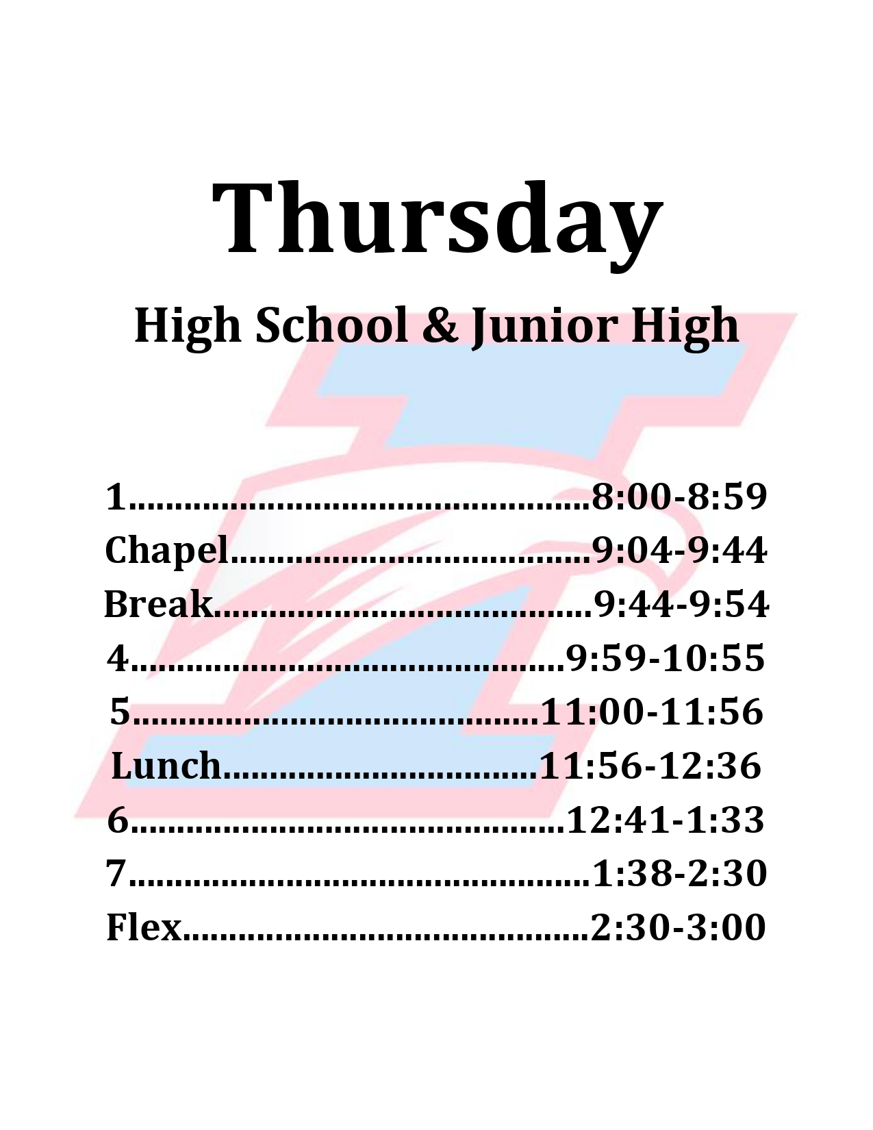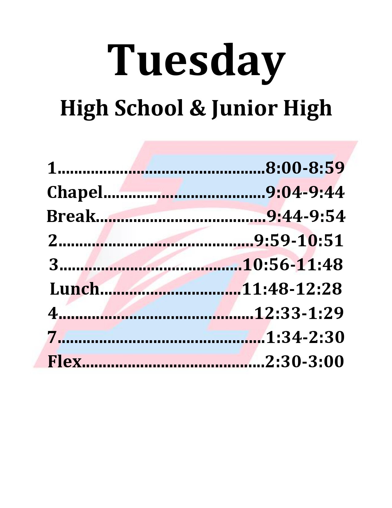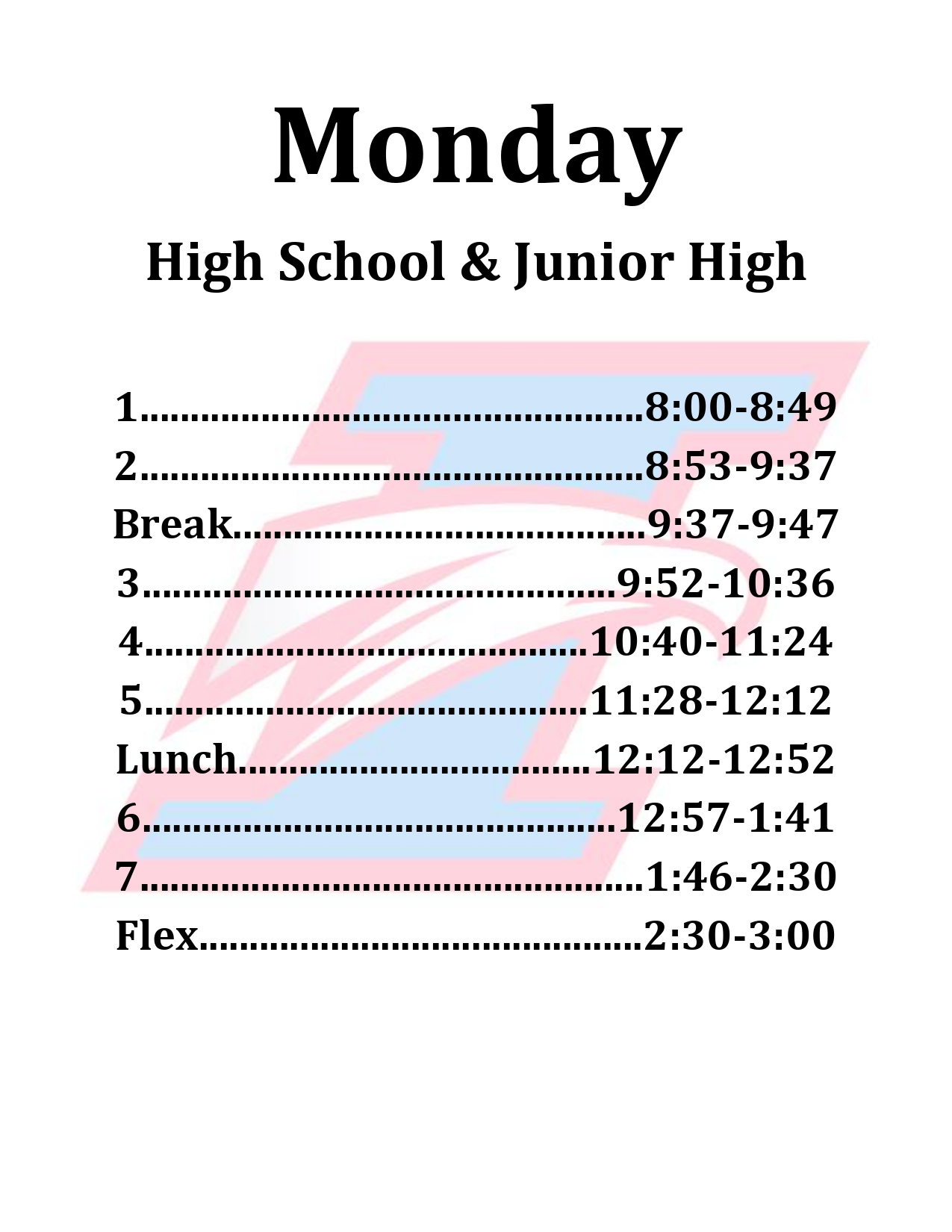 JH/HS Athletes: You are NOT allowed to walk to the Sports Complex for practice or games! We will provide transportation, either a bus or shuttle/van to take you to the Complex. If you have any questions, please talk to Mrs. Burns. The flex shuttle departs at 2:40 (M, T, TH, F) and 2:10 (W) and the after school shuttle depart at 3:10 (M, T, TH, F) and 2:40 (W).
